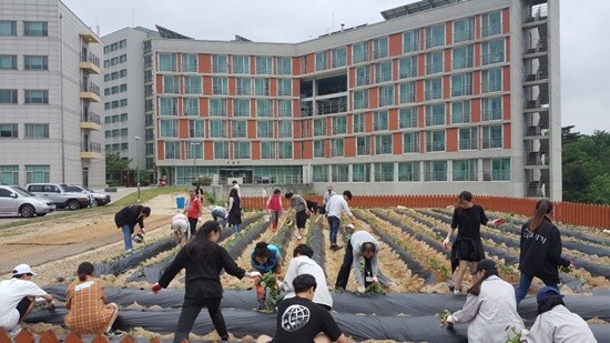 [대학저널 임승미 기자] 코리아텍(총장 김기영) 생활관 자치회 및 상담 동아리 ‘디딤지기’학생들과 행정실 직원 등 50여 명은 지난 16일 교내 생활관(은솔관) 옆 500㎡(약 150평) 규모의 ‘나우리 행복텃밭’에 지역 소외계층을 위해 고구마 모종 1000 포기를 심었다.