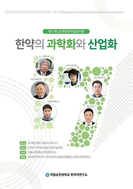 ‘한약의 과학화와 산업화’를 주제로 한 이번 심포지엄은 순천대 한의약연구소(소장 박종철)가 주최하고, (주)네이처바이오, 지리산로하스 영농조합법인, 순천대 김치연구소가 후원한다. 심포지엄은 한약 분야 전문가 6명이 발제자로 나서, 세계 각국의 전통의약과 우리 한약의 과학화를 위한 새로운 방향을 제시할 전망이다.
