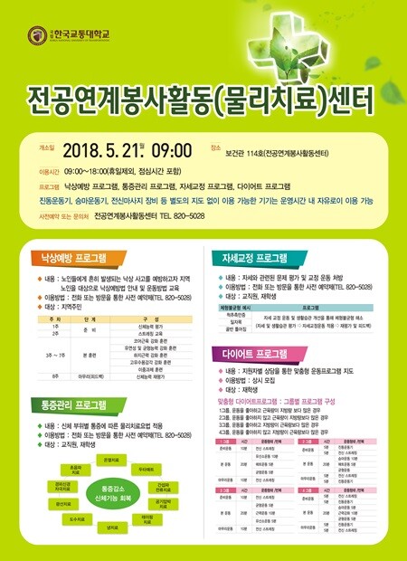전공연계봉사활동센터는 지역사회와의 상생발전과 증평캠퍼스의 재학생 및 교직원의 복지향상을 위해 구축됐다. 지역주민을 위한 낙상예방프로그램 및 교직원 및 재학생을 위한 통증관리, 자세교정, 다이어트프로그램이 운영된다.