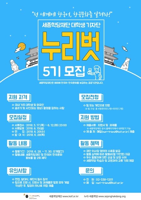 [대학저널 임승미 기자] 세종학당재단(이사장 송향근, 이하 재단)은 오는 6월 12일까지 대학생 기자단 ‘누리벗 5기’16명을 모집한다.