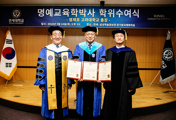 연세대는 염재호 고려대 총장이 양교의 상호 발전을 넘어 사회 전반의 고등 교육 혁신을 이끈 공로를 인정해 명예 교육학박사 학위를 수여했다.