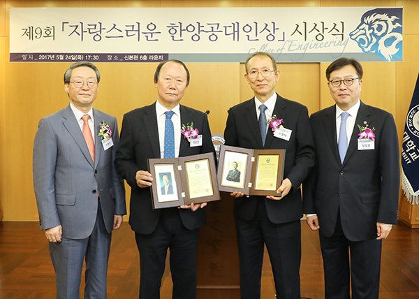 [대학저널 신효송 기자] 한양대학교(총장 이영무)가 지난 24일 한양대 서울캠퍼스에서 '자랑스러운 한양공대인상' 시상식을 개최했다. 이 상은 한양대 공과대학 졸업생 가운데 사회에 크게 기여하고 업적이 우수한 동문에게 수여하는 상으로 2001년 제정됐다. 올해는 정상진 HDX회장과 이범택 크린토피아 회장이 이 상을 수상했다.