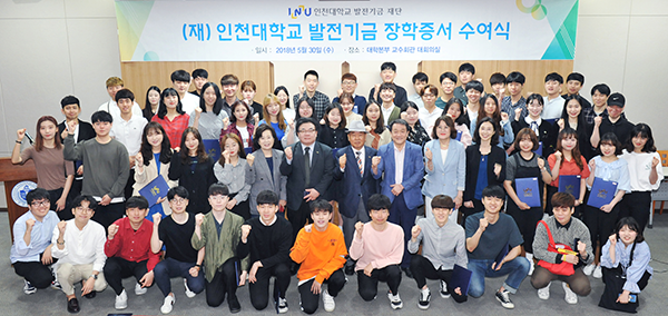 [대학저널 신효송 기자] 인천대학교(총장 조동성) 발전기금 재단(이사장 조동성 총장)이 30일 인천대 송도캠퍼스 교수회관에서 ‘2018학년도 1학기 장학증서 수여식’을 개최했다.