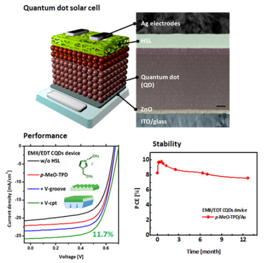 연구팀은 단분자 박막을 이용한 양자점 태양전지를 제작해 약 11.7%의 최고효율을 달성했고, 산소 및 수분 저항성을 확보해 소자를 공기 중에서 보관할 시 약 1년이 지나도 초기 효율의 90% 이상을 유지함을 확인했다.