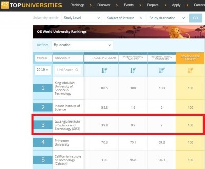 [대학저널 오혜민 기자] GIST(총장 문승현)가 영국 글로벌 대학 평가 기관 QS(Quacquarelli Symonds)가 7일(한국시각) 발표한 2018/19 QS 세계 대학 평가 ‘교수 1인당 논문 피인용 수’ 부문에서 세계 3위로 평가됐다.