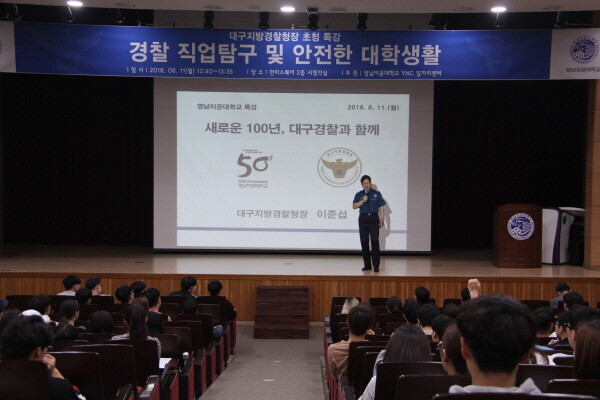 [대학저널 임지연 기자] 영남이공대학교(총장 박재훈)가 11일 영남이공대 천마스퀘어 시청각실에서 경찰직업탐구 및 안전한 대학생활을 주제로 대구지방경찰청 이준섭 청장 초청 특강을 진행했다.