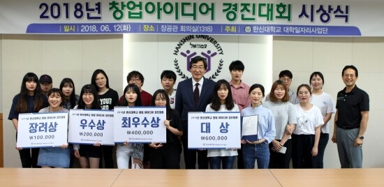 한편 2018 창업 아이디어 경진대회는 학생들의 창의적이고 우수한 창업 아이디어를 발굴하고 사업화를 지원해 학생 창업의 성공가능성을 열어주기 위한 것으로 한신대 재학생 21개 팀, 총 74명이 참여했다.