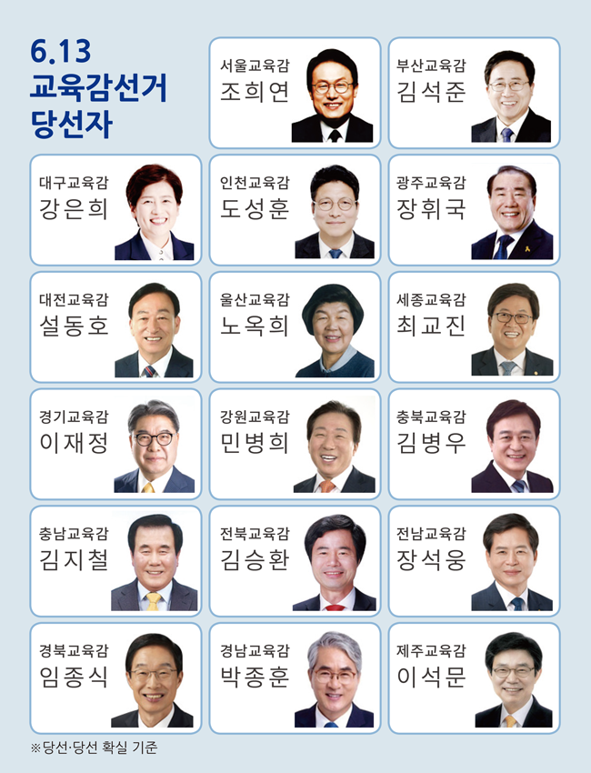 [대학저널 신효송 기자] 6월 13일 제7회 전국동시지방선거 결과, 서울시교육감에 조희연, 경기도교육감에 이재정 등 전국 17개 시·도 교육감 당선이 확정됐다.