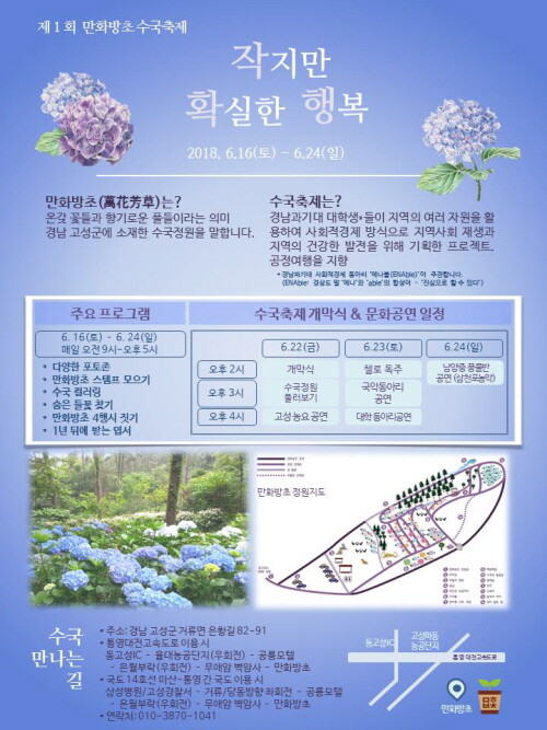 [대학저널 임지연 기자] 경남과학기술대학교(총장 김남경) 사회적경제사업단 소셜랩 동아리 ‘에나블’(ENAble)이 주관하는 제1회 고성 만화방초 수국축제가 오는 22일부터 24일까지 만화방초에서 열린다.
