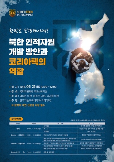 [대학저널 임승미 기자] 코리아텍(한국기술교육대학교)은 오는 25일 오전 여의도 국회의원회관 제2소회의실에서 '한반도 신경제시대! 북한 인적자원개발 방안과 코리아텍의 역할'을 주제로 포럼을 개최한다.