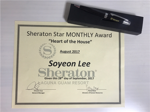 [대학저널 최진 기자] 세종대학교(총장 신 구) 호텔관광경영학과 이소연 씨가 괌 쉐라톤 호텔에서 ‘이달의 사원상’을 수상했다. 괌 쉐라톤 호텔이 인턴사원에게 ‘이달의 사원상’을 수여한 것은 이번이 처음이다.