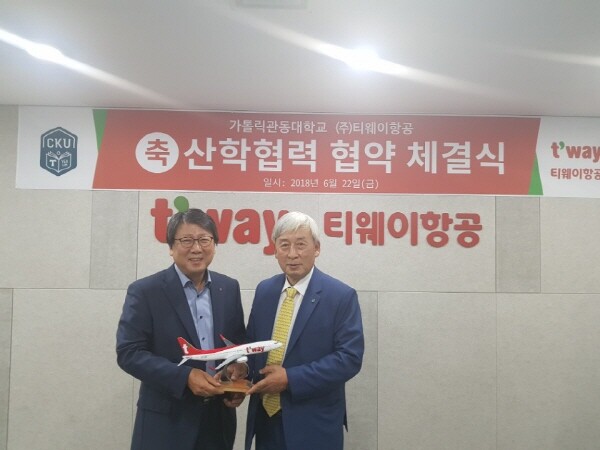 이날 협약으로 가톨릭관동대는 티웨이항공과 조종사, 정비사, 객실승무원 등 항공전문 인력 양성을 선도할 계획이다. 티웨이항공은 가톨릭관동대에서 양성된 인력을 적극적으로 채용하기로 했다.