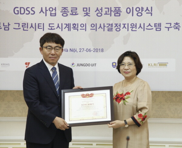 [대학저널 임지연 기자] 안양대학교(총장 유석성)가 6월 27일 베트남 건설부 청사 회의실에서 개최된 ‘베트남 그린시티 도시계획 의사결정지원시스템(GDSS) 사업 종료 및 성과품 이양식’에서 베트남 건설 산업 발전에 기여한 공로를 인정받아 건설부 장관 표창을 받았다.