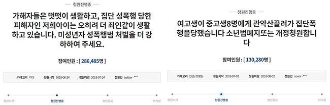 #2018년 3월 대구에 사는 여중생 A양이 청소년 7명에게 집단 성폭행을 당했다. 가해자들은 A양의 사진을 찍고 폭행까지 일삼았다. 가해자들은 구속 혹은 불구속 형태로 재판이 진행 중이다. 피해자 부모에 따르면 가해자들은 이번 사건을 자랑스럽게 여기는가 하면, 허위 사실 유포도 서슴치 않고 있다. A양은 주변사람들의 수근거림과 따돌림을 견디다 못해 대안학교 준비를 하고 있다.