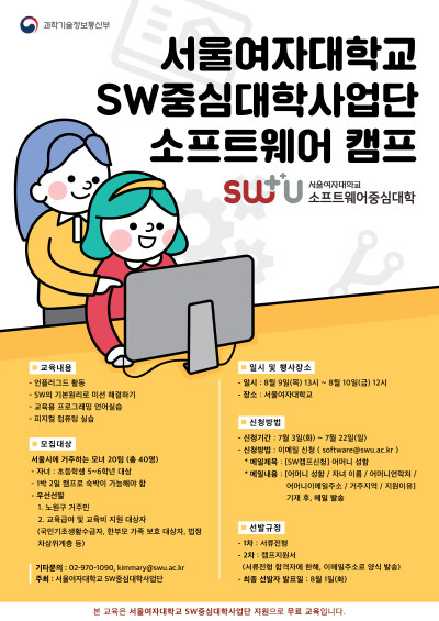 [대학저널 최진 기자] 서울여자대학교(총장 전혜정)는 8월 9일부터 10일까지 서울여대 인문사회관에서 초등학생과 학부모가 함께 SW를 배울 수 있는 여름방학 ‘소트프웨어 캠프’를 개최한다.