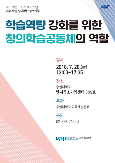 [대학저널 최진 기자] 숭실대학교(총장 황준성)는 20일 숭실대 벤처중소기업센터 309호에서 2018학년도 하계 ACE+사업 교수학습 성과확산 심포지엄을 개최했다.