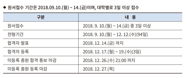 원서접수는 기간은 9월 10일부터 14일까지 대학별 3일 이상이며 합격자 발표는 12월 14일까지, 합격자 등록은 12월 17일부터 19일까지다.