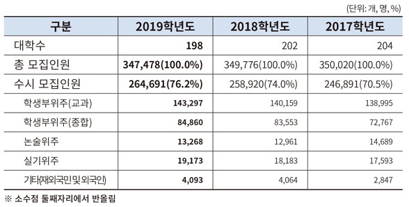 [대학저널 최창식 기자] 2019학년도 수시모집 인원은 총 26만 4,691명으로 지난해보다 5,771명이 늘었다. 모집 비율로는 총 모집인원의 76.2%로 지난해 74.0%보다 2.2% 포인트 증가했다.