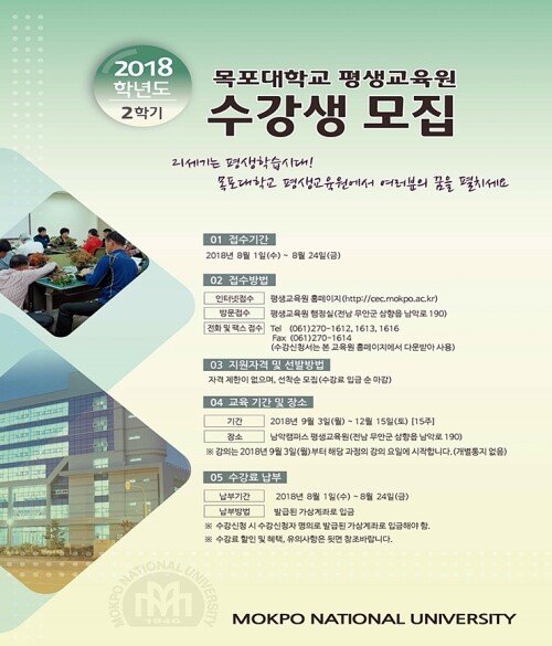 [대학저널 오혜민 기자] 목포대학교 평생교육원이 8월 1일부터 24일까지 2018학년도 2학기 평생교육원 수강생을 모집한다.