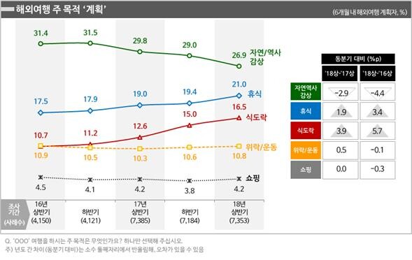 지난 1년간(2017년 하반기~2018년 상반기) 휴식을 주목적으로 계획한 여행지는 남태평양과 동남아시아에 집중해 있었다. 괌은 휴식이 주목적인 경우가 절반을 차지했고(50.5%), 다음은 사이판 47.4%, 인도네시아 44.6%, 태국 36.2%, 필리핀 36.0% 등의 순이었다. 식도락 여행지는 아시아 지역이 대세로, TOP5를 독점했다. 그 중 대만이 30.4%로 가장 높았고, 다음은 일본 23.1%, 홍콩 17.6%, 태국과 베트남(각각 17.0%)의 순이었다.