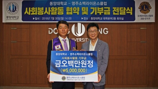 이날 협약식에서 영주소백라이온스클럽은 동양대에 지역사회봉사활동을 위한 기부금 500만 원을 전달했다. 이번 협약은 양 기관단체가 정보 교류와 지역사회 봉사활동 협력 체제를 구축하고 효율적 봉사활동을 추진하기 위해 마련됐다. 양 기관단체는 협약을 통해 △상호협력체제 구축 △지역 사회봉사 활동 및 활성화를 위한 상호지원 △업무 지원 등을 적극적으로 협력해나가기로 했다.