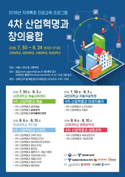 교육부(장관 김상곤)가 주최하고 서경대 예술교육센터(센터장 김범준)와 성북문화재단 미래창창 성북청소년진로직업체험지원센터(센터장 유재선)가 공동으로 주관하는 이번 진로체험 행사는 7월 30일부터 8월 3일까지 5일 간 ‘4차 산업혁명과 예술’이라는 주제 아래 심화형 진로캠프 형태로 진행될 예정이다.