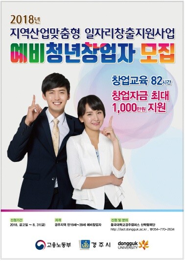 [대학저널 최진 기자] 동국대학교 경주캠퍼스 산학협력단(단장 김규태)이 고용노동부가 주최하는 '2018년 지역산업 맞춤형 일자리창출 지원사업'에 따른 예비청년창업자를 오는 31일까지 모집한다.