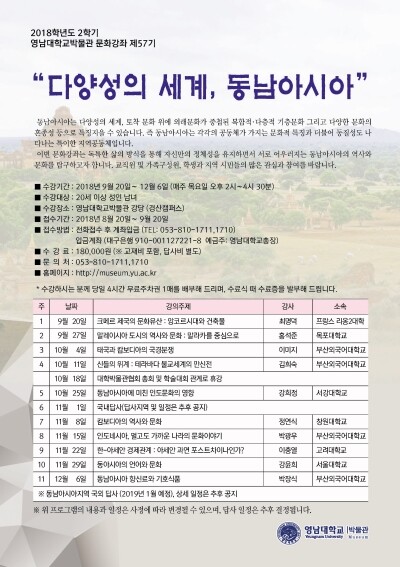지역문화 저변확대를 위해 올해로 30년째 문화강좌를 열고 있는 영남대 박물관이 제57기 문화강좌 ‘다양성의 세계, 동남아시아’를 개설하고 다양한 인종과 문화가 어우러진 동남아시아의 역사와 문화적 특징에 대해 살펴보는 시간을 마련했다.