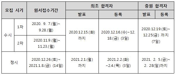 2021학년도 전문대학 전형 일정은 2020학년도와 마찬가지로 수시모집은 2회(차)까지 운영하고, 정시모집은 한 차례만 실시한다. 원서 접수일정도 학생·학부모가 쉽게 기억하고 충분히 진로·진학 계획을 세울 수 있도록 전국 모든 전문대학이 동일하게 운영한다.