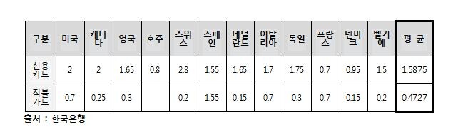 이어 김 교수는 “체크카드의 경우 고객 통장에서 즉시 출금되므로 채권의 부실율이 없고, 자금조달비용이 발생하지 않는다. 동일한 구조인 은행권의 직불카드와 현금카드의 수수료가 1% 수준인 것을 감안할 때, 카드사들의 체크카드는 약 1.7%로, 0.7%나 높을 이유가 없다”며 체크카드 수수료를 1% 이하로 낮춰야 한다고 주장했다.