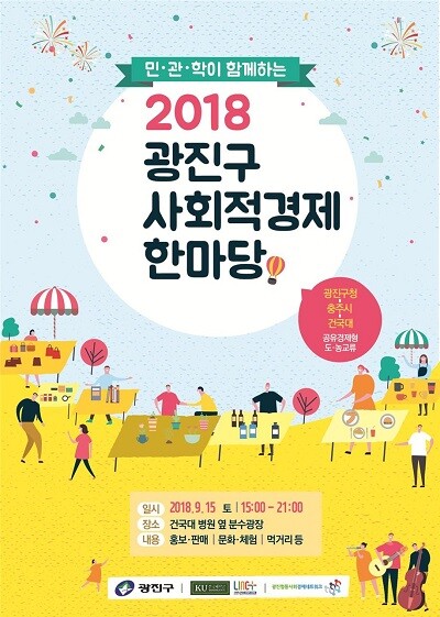 [대학저널 임지연 기자] 건국대학교(총장 민상기)가 지역 및 단체의 교류·협력을 통한 지역경제 활성화를 위해 오는 15일 오후 3시 서울 광진구 건국대 분수광장에서 ’2018 광진 사회적경제 한마당’을 개최한다.