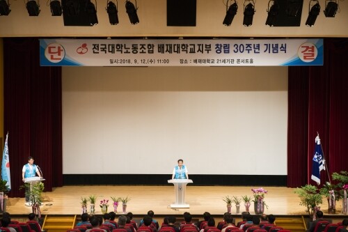 [대학저널 오혜민 기자] 전국대학노동조합 배재대학교지부(지부장 염경철‧배재대 노조)는 12일 조합원 등 150여 명이 참석한 가운데 대학 콘서트홀에서 창립 30주년 기념식을 열었다.