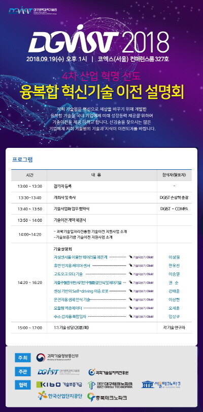 한편 DGIST 2018 융복합 혁신기술 이전 설명회에 대한 문의사항은 DGIST 지식재산경영팀(053-785-1989, 1913)으로 연락하면 된다. 참가신청은 홈페이지(www.bizmatch.kr/dgist)에서 할 수 있다.