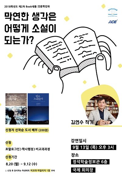 정석학술정보관이 진행하는 독서권장프로젝트 ‘Book돋움’ 행사 일환으로 열리는 이번 행사는 오는 13일 정석학술정보관 6층 국제회의장에서 열린다. 강연 주제는 ‘막연한 생각은 어떻게 소설이 되는가?’로 김연수 작가의 경험이 강연 곳곳에 담길 예정이다. 일상 속에서 발견한 작은 생각이 어떤 과정을 거쳐 단편소설이나 장편소설로 탄생하는지 설명한다.