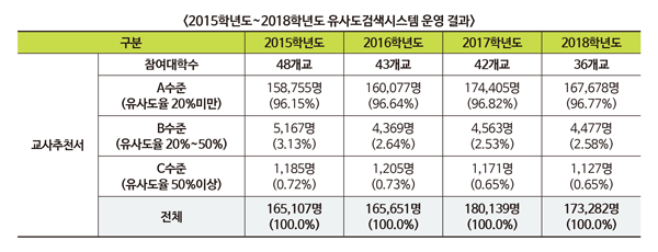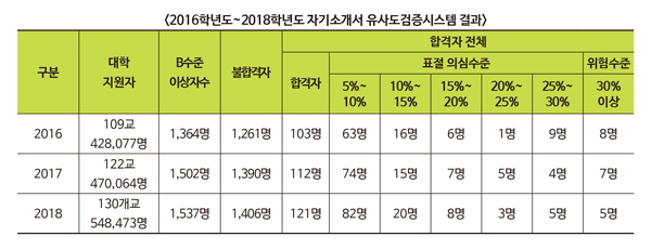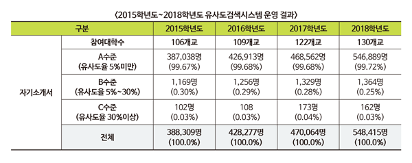 유사도 검색 시스템에 따른 자소서 표절 수는 해를 거듭할수록 증가하고 있다. 2018학년도 기준 A수준에 해당하는 학생은 54만 6889명, B수준은 1364명, C수준은 162명으로 나타났다.