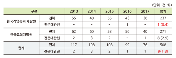 이들의 정책연구 현황을 분석한 결과, 한국교육개발원은 2013년부터 2017년까지 5년 간 228건의 연구를 수행했고, 그 중 전문대학과 직접 관련된 연구는 1건에 불과했다. 또 같은 기간 한국직업능력개발원은 271건의 정책연구를 수행했고, 그 중 전문대학과 직접 관련된 연구는 8건에 그쳤다.