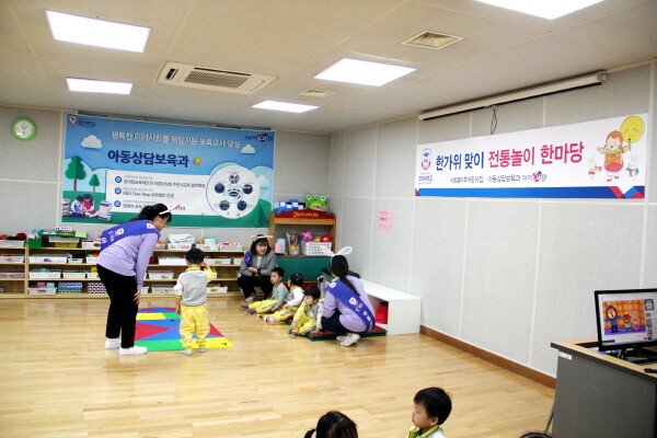 행사에 참여한 28명의 영유아들은 아동상담보육과 재학생들과 투호놀이, 제기차기, 윷놀이, 사방치기 등 전통놀이를 신나게 즐겼다.