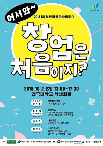 [대학저널 임지연 기자] 건국대학교(총장 민상기)는 오는 2일 건국대 학생회관에서 ‘어서와 창업은 처음이지?’라는 주제로 ‘2018 KU 청년창업한마당투어’ 행사를 개최한다.