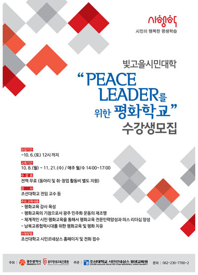 [대학저널 신영경 기자] 조선대학교(총장 강동완) 시민르네상스평생교육원은 10월 8일부터 11월 21일까지 빛고을시민대학 'PEACE LEADER를 위한 평화학교'를 운영한다.