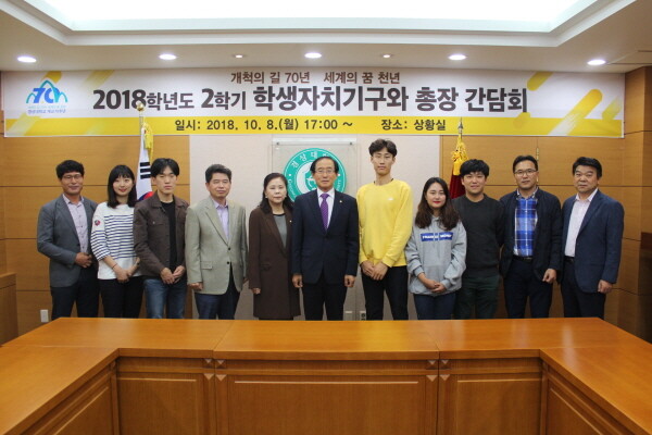 [대학저널 임지연 기자] 경상대학교 이상경 총장이 지난 8일 경상대 3층 상황실에서 서여훈 총학생회장 등 학생중앙자치기구 회장단이 참석한 가운데 ‘2018학년도 2학기 학생자치기구와 총장 간담회’를 열었다.