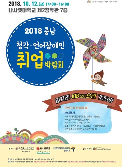 [대학저널 오혜민 기자] 나사렛대학교(총장 임승안)가 한국농아인협회 충청남도협회(회장 노윤철), 한국장애인고용공단 충남지사(지사장 류정진)와 공동주관으로 오는 12일 나사렛대 제2창학관에서 2018년 충남 청각·언어장애인 취업박람회를 연다.
