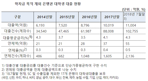 '학자금 목적 제외 은행권 대학생 대출'은 차주의 연령과 상관없이 대출 시점에 차주가 직업란을 대학생으로 작성한 대출이다. 레지던트, 법학전문대학원생, 일반대학원생 등이 포함된 것으로 대학생들이 생활비 명목 등으로 대출한 현황이다.