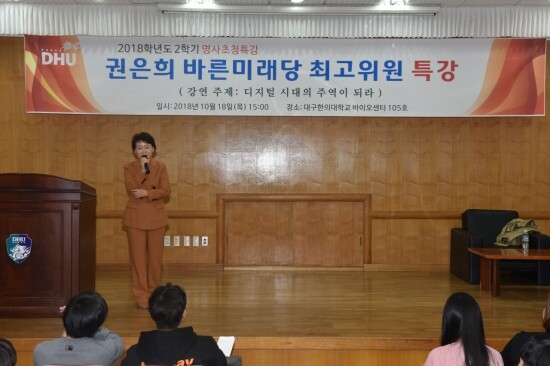 [대학저널 오혜민 기자] 대구한의대학교(총장 변창훈)는 지난 18일 오후 바이오센터 강당에서 재학생 200여 명이 참석한 가운데 바른미래당 권은희 최고위원을 초청해 ‘디지털시대의 주역이 되라’는 주제로 특강을 실시했다.