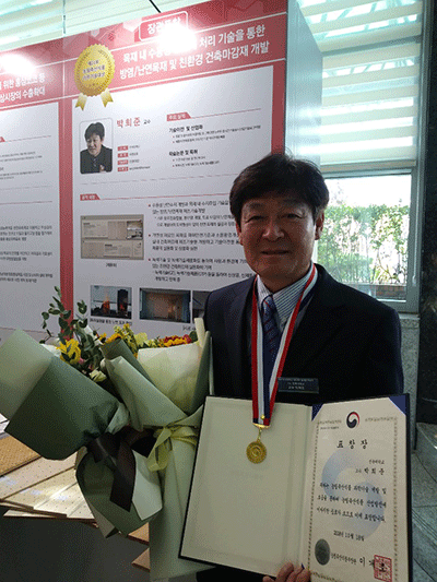 박희준 교수는 수용성 난연제 처리 기술을 통해 불에 타지 않는 방염·난연 목재 제조 기술을 개발하고, 이를 기업에 기술이전해 상용화에 성공한 공로를 인정받았다.