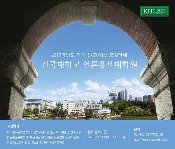 [대학저널 임지연 기자] 건국대학교(총장 민상기) 언론홍보대학원(원장 김동규)은 오는 10월 29일부터 11월 16일까지 디지털저널리즘학과(융합저널리즘전공, 디지털출판·잡지전공), 방송통신융합학과(방송영상통신전공, 방송진행·스피치전공), 광고홍보학과(광고·홍보전공, 공연예술경영전공) 등 3개 학과 6개 전공을 대상으로 2019학년도 전기 석사과정 신(편)입생을 모집한다.
