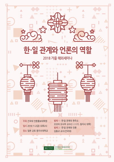 [대학저널 임지연 기자] 건국대학교(총장 민상기) 언론홍보대학원(원장 김동규)은 오는 11월 2일 일본 교토 동지사대학에서 ‘한일 관계와 언론의 역할’을 주제로 2018 추계학술세미나를 개최한다.