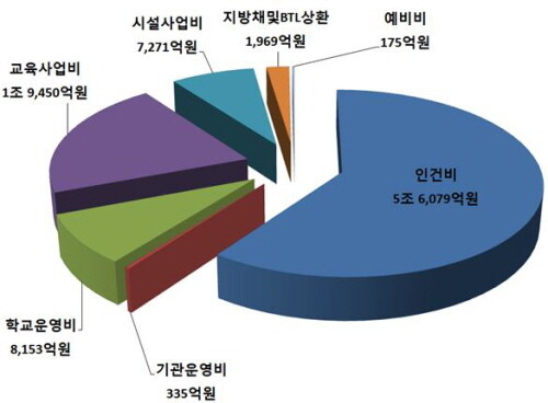 세출예산안은 ▲인건비 5조 6079억 원 ▲기관운영비 335억 원 ▲학교운영비 8153억 원 ▲교육사업비 1조 9450억 원 ▲학교 신·증설 등 시설사업비 7271억 원 ▲지방교육채 상환 등 1969억 원 ▲예비비 175억 원으로 총 9조 3432억 원이다.