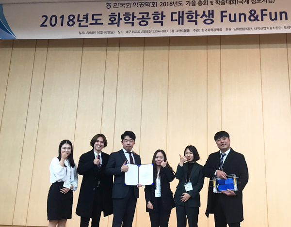[대학저널 김등대 기자] 경상대학교(총장 이상경) 공과대학 화학공학과 학생팀이 10월 26일 대구 엑스코(EXCO)에서 개최된 ‘2018 화학공학 대학생 펀&펀 페스티벌’ 경진대회에서 금상을 수상했다.
