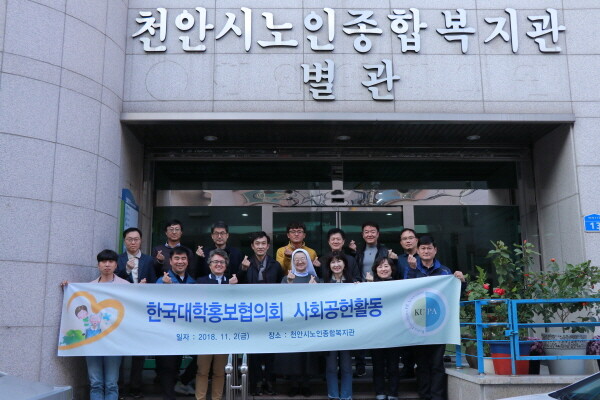 [대학저널 임지연 기자] 한국대학홍보협의회(회장 변재덕 동국대 홍보실장) 집행부가 지난 2일 천안시 노인종합복지관을 찾아 사회공헌 활동을 비롯해 후원금을 전달하는 행사를 가졌다.