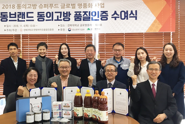 [대학저널 김등대 기자] 경북대학교(총장 김상동) 한방바이오융합진흥원(원장 황의욱)이 한방소재를 활용한 3개 기업 18개 제품을 ‘동의고방 슈퍼푸드’로 인증하고 지난 6일 경북대 글로벌플라자에서 품질인증 수여식을 열었다.